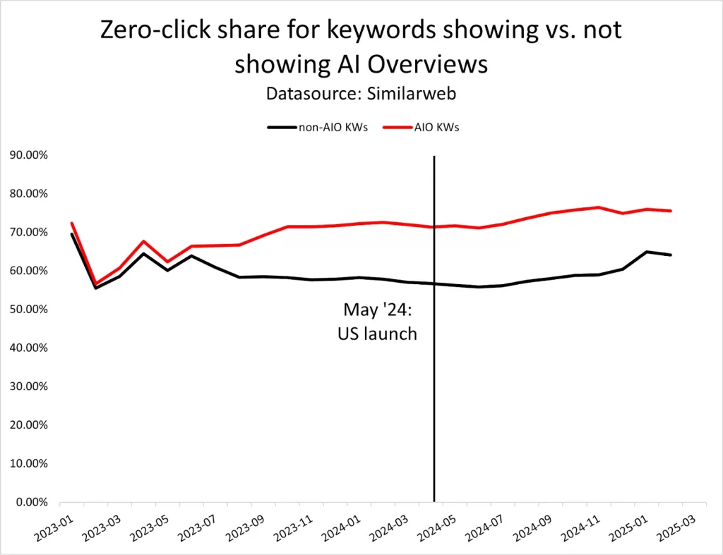 Nhiều từ khóa không có lượt nhấp chuột nào sau khi AI Overviews chính thức ra mắt vào tháng 5 năm 2024 cũng không có lượt nhấp chuột nào trước khi ra mắt.