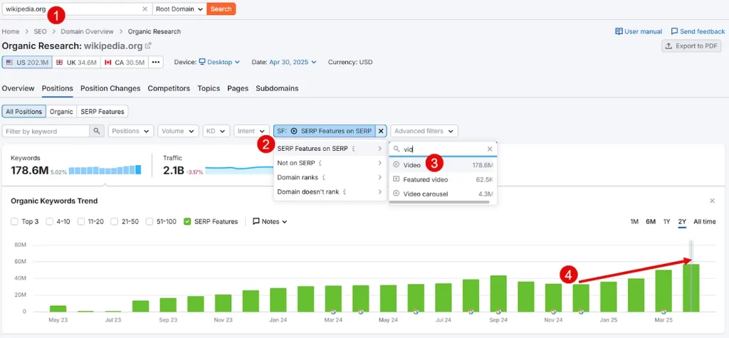 Ví dụ, Semrush cho thấy một xu hướng tăng rõ ràng về số lượng video xuất hiện cho các thuật ngữ mà Wikipedia, một trong những trang web lớn nhất trên web, xếp hạng.