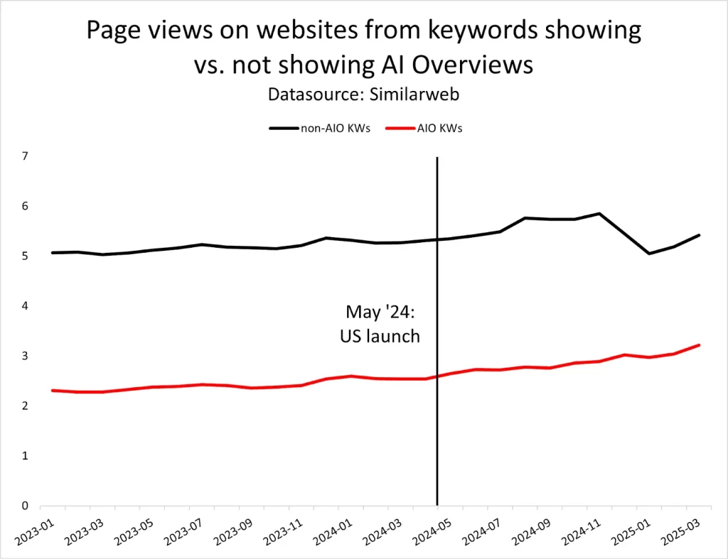 Để công bằng, có thể lập luận ủng hộ quan điểm của Pichai ở đây rằng lượt xem trang từ các từ khóa có AI Overviews đã tăng 21,5% kể từ khi triển khai vào tháng 5 năm 2024, so với chỉ 1,3% tăng trưởng cho các từ khóa không có AI Overviews trong cùng kỳ (cho đến tháng 11 năm 2024, sau đó chúng giảm).