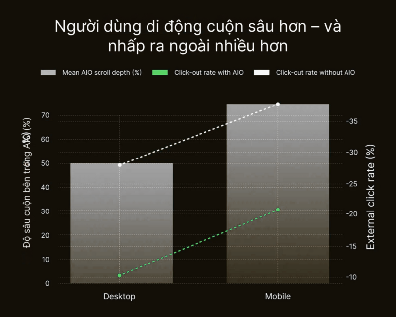 1. Dự đoán và lập ngân sách cho sự sụt giảm mang tính cấu trúc trong các phiên truy cập tự nhiên . Các AI Overviews cắt giảm khoảng một nửa lượt nhấp chuột ra ngoài trên máy tính để bàn và một phần ba trên thiết bị di động; các mô hình doanh thu gắn liền với phiên truy cập (quảng cáo, tiếp thị liên kết) cần các chiến lược phòng ngừa.