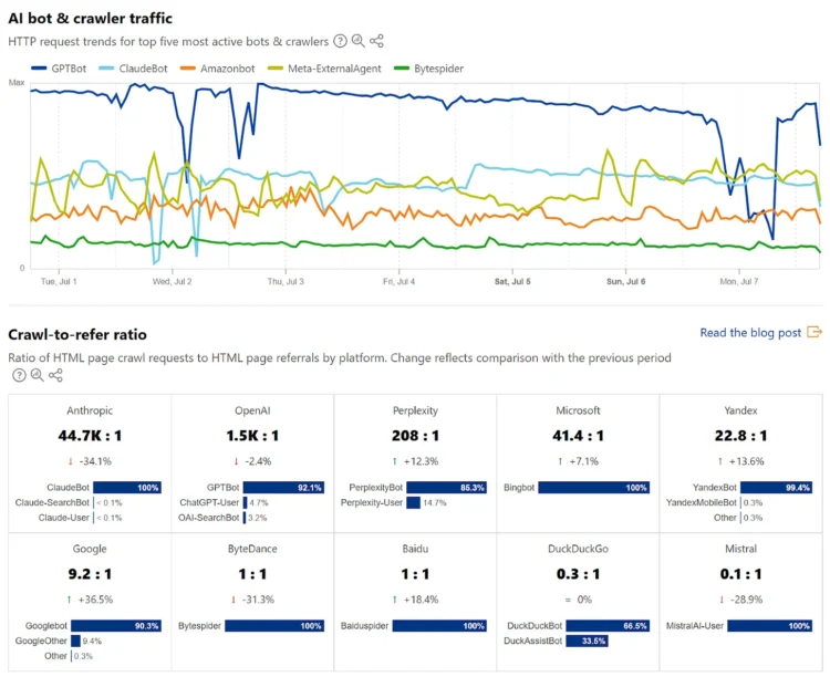 Trình thu thập dữ liệu AI thường chỉ gửi một phần rất nhỏ lưu lượng truy cập so với lượt thu thập dữ liệu của chúng (xem ảnh chụp màn hình ở trên). Với mỗi lượt truy cập, OpenAI thu thập dữ liệu trung bình một trang web 1.500 lần – Perplexity 208 lần và Google 9,2 lần – trong 12 tháng qua.