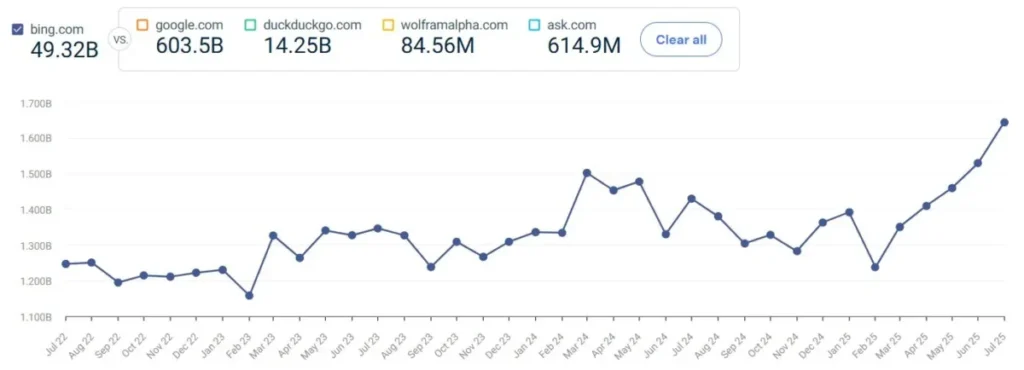 Dưới đây là những gì đã xảy ra: Bing đã tăng trưởng khoảng 20% từ Tháng 1 đến Tháng 7 năm 2025, chủ yếu là lưu lượng trực tiếp tại Mỹ.