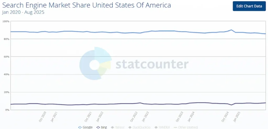 Dựa trên StatCounter, Google chiếm khoảng 85,7% thị phần tại Mỹ vào Tháng 8/2025, so với 87,3% vào Tháng 8/2020.
