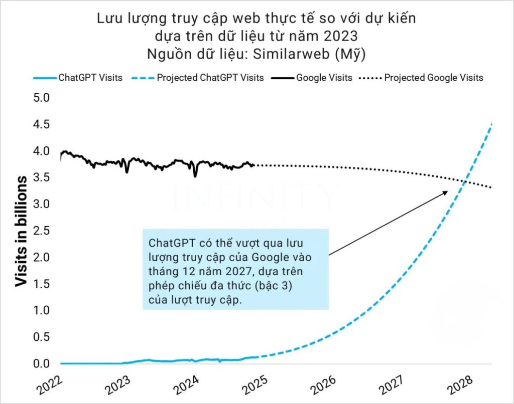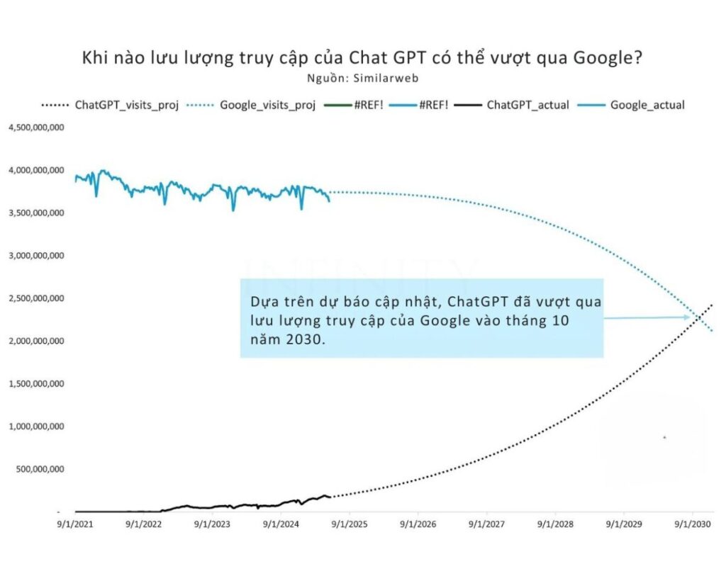 - Nếu bạn mở rộng toàn bộ tập dữ liệu , ChatGPT sẽ vượt qua Google vào tháng 10 năm 2030 .