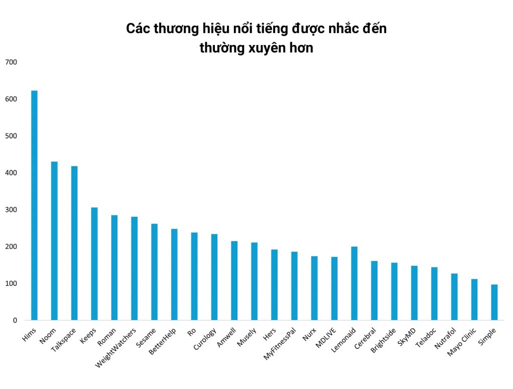 - Có mối liên hệ rõ ràng giữa các danh mục câu hỏi của người dùng (sức khỏe tâm thần, chăm sóc da, giảm cân, rụng tóc, rối loạn cương dương) và thương hiệu.