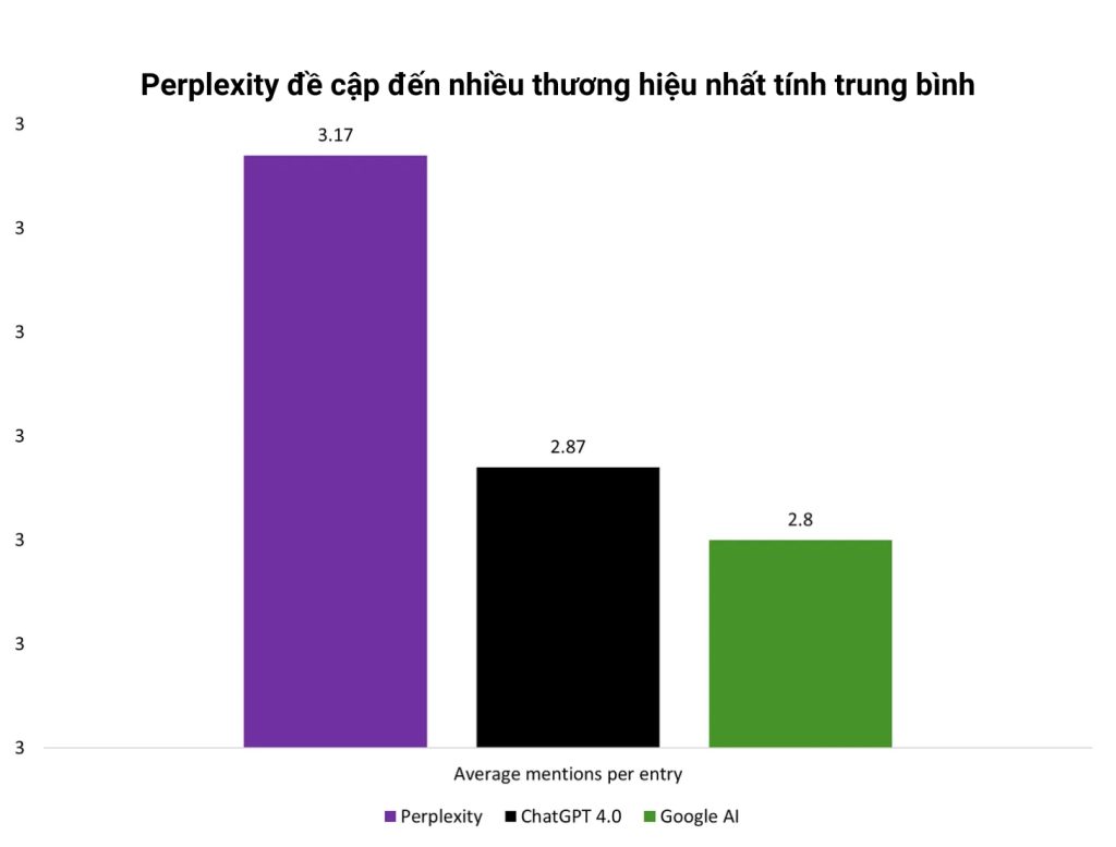 Bối cảnh: Không phải tất cả các chatbot AI đều đề cập đến các thương hiệu với tần suất như nhau. Mặc dù Chat GPT có tỷ lệ sử dụng cao nhất và gửi lưu lượng truy cập giới thiệu đến các nguồn nhiều nhất, Perplexity lại đề cập đến nhiều thương hiệu nhất theo trung bình trong các câu trả lời.