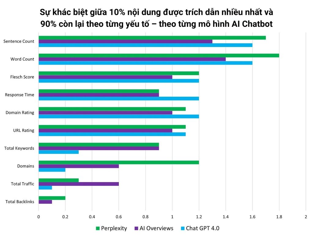 - Các số liệu SEO truyền thống không ảnh hưởng nhiều đến trích dẫn của AI Chatbot
