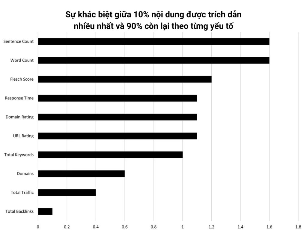 - Hai yếu tố nổi bật là số lượng câu và số từ , tiếp theo là Điểm Flesch . Các số liệu liên quan đến backlink và lưu lượng truy cập dường như có tác động tiêu cực, điều này không có nghĩa là Chatbot AI đánh giá thấp chúng mà chỉ đơn giản là chúng không quan trọng đối với lượt đề cập hoặc trích dẫn.